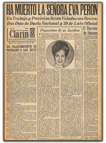 “Cumple la Secretaría de Informaciones de la Presidencia de la Nación el penosísimo deber de informar al pueblo de la República que a las 20.25 horas ha fallecido la Señora Eva Perón, Jefa Espiritual de la Nación. Los restos de la Señora Eva Perón serán conducidos mañana, al Ministerio de Trabajo y Previsión, donde se instalará la capilla ardiente”