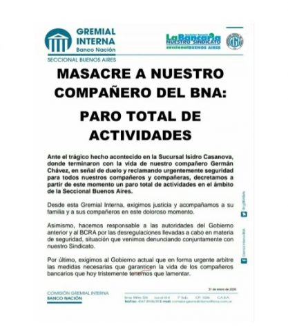 Y concluyó: "Exigimos al Gobierno actual que en forma urgente arbitre las medidas necesarias que garanticen la vida de los compañeros bancarios que hoy tristemente tenemos que lamentar".