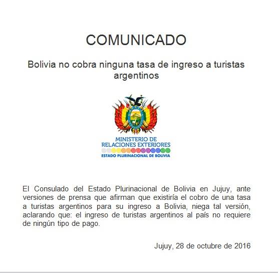 "El consulado del Estado Plurinacional de Bolivia en Jujuy, ante versiones de prensa que afirman que existiría el cobro de una tasa a turistas argentinos para su ingreso a Bolivia, niega tal versión, aclarando que el ingreso de turistas argentinos al país no requiere de ningún tipo de pago”, dice el comunicado, fechado ayer.