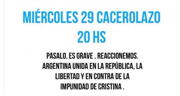 Argentina unida en la República, la libertad y en contra de la impunidad de Cristina", dice la convocatoria para el cacerolazo de este miércoles.