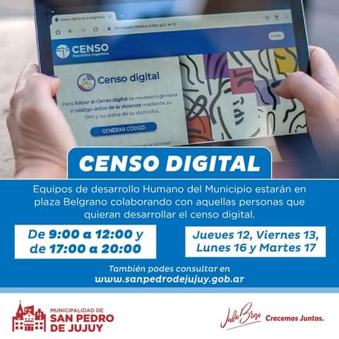 En el marco del Censo Nacional 2022, la Municipalidad de San Pedro a través de la oficina de Desarrollo Humano informa que los días jueves 12, viernes 13, lunes 16 y martes 17 de mayo, equipos especiales de Desarrollo Humano estarán en Plaza Belgrano, de 09:00 a 12:00 y de 17:00 a 20:00 horas, colaborando con aquellas personas que quieran desarrollar el Censo Digital.