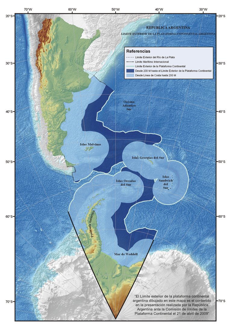 Por un fallo de la ONU, el país extendió un 35% su plataforma marítima: ganó 1,7 millón de kilómetros cuadrados. Es un hecho histórico que reafirma los derechos de soberanía sobre Malvinas y una zona estratégica como el Atlántico Sur. La plataforma abarca el lecho y el subsuelo de las áreas submarinas hasta más allá del mar territorial de toda la prolongación natural del territorio. Hasta ahora llegaba hasta los 200 metros de profundidad independientemente de las 200 millas de la llamada zona de exclusión marítima. Sin embargo, ahora ya no hay límites de profundidad y además se extendió el límite de la base desde la costa hasta las 350 millas