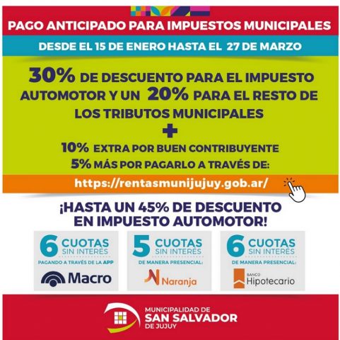 De esta forma, la Municipalidad de San Salvador de Jujuy, informó que los descuentos por el pago anticipado de los impuestos municipales, se ejecutarán de distintas formas, dependiéndola modalidad de pago: