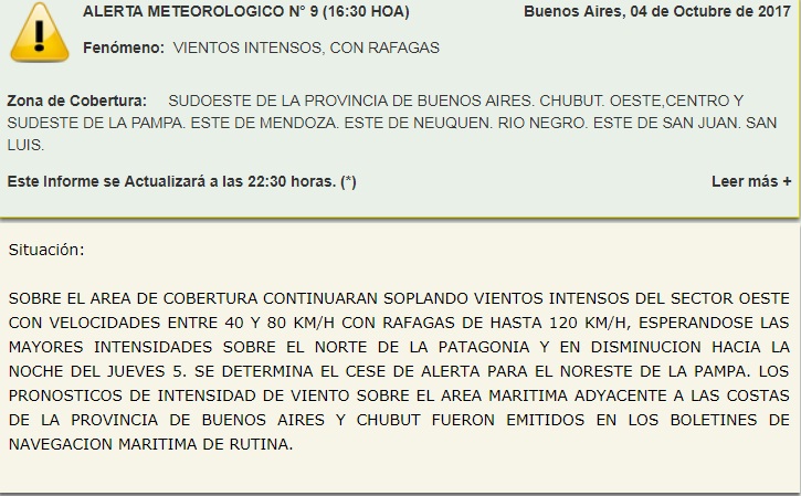 Por otro lado Bs. As. Chubut, Oeste, Centro y sudeste de La Pampa, Este de Mendoza, Este Neuquen, Río Negro, Este de San Juan, San Luis, La Rioja y Salta, presentarían vientos intensos con ráfagas de entre 40 y 80 km/h hasta 120 km/h.