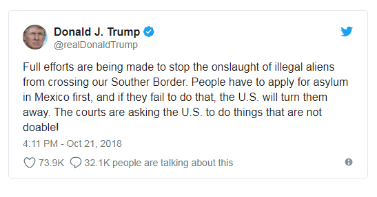 "Las personas deben solicitar asilo en México primero, y si no lo hacen, EE.UU. los rechazará. ¡Los tribunales están pidiendo a EE.UU. que haga cosas que no son factibles!", afirmó el presidente de Estados Unidos a través de su cuenta de Twitter, en alusión a la caravana de inmigrantes que hace días partió de Honduras hacia territorio estadounidense.