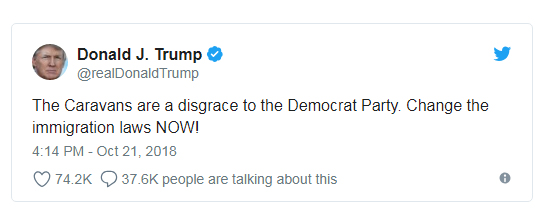 "Las caravanas son una desgracia para el Partido Demócrata. ¡Cambien las leyes de inmigración AHORA!", agregó en otro tuit.