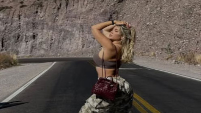 Durante ese traslado, se mostró posando en medio de una ruta asfaltada de montaña, con pantalones estampados en tonos tierra, un top deportivo y una cartera pequeña. A su alrededor, la geografía imponente de la quebrada: formaciones rocosas, cactus y cerros erosionados, que están marcando este viaje de relax como pausa al usual caos mediático que la rodea.