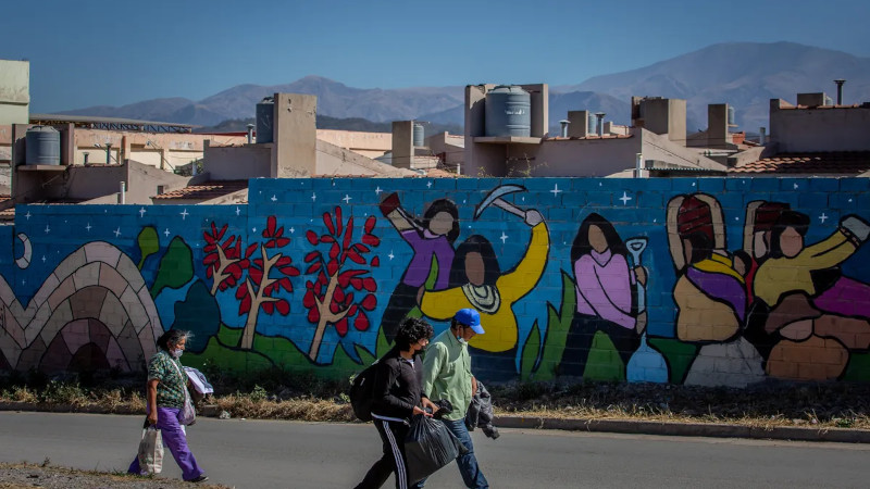 Las pintadas descoloridas que todavía se leen en algunos puentes que cruzan la Ruta Nacional 9, en la capital jujeña, son un anuncio de lo que se verá unos pocos kilómetros más adelante. En letras de un celeste que se apaga, promocionan “Milagro al Parlasur”, o, en un color negro que se hace tenue, muestran el logo de la agrupación Tupac Amaru, que aparecerá en todos los tanques de agua de las casas del barrio en Alto Comedero. La réplica del templo Kalasasaya, que oficia como bienvenida a la barriada, sintetiza el abandono, con sus estatuas vandalizadas, grafitis de todo tipo, yuyos crecidos y paredes transformadas en escombros.