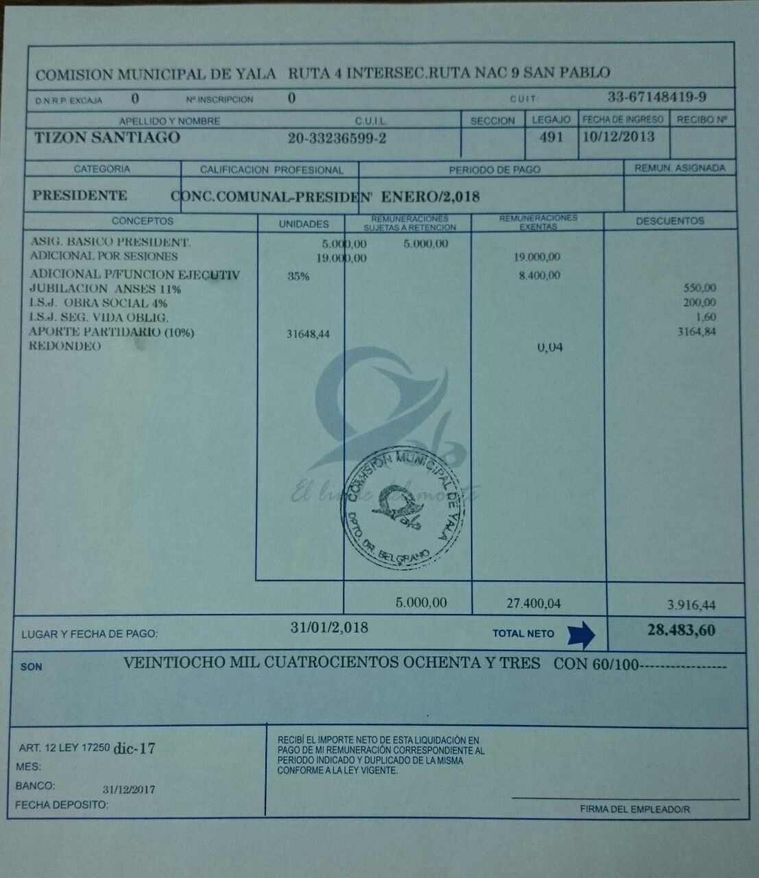 El comunicado de la comisión municipal de Yala adjunta un comparativo de recibos de sueldos pertenecientes al Comisionado Tizón por los periodos DICIEMBRE/2017 en donde el Comisionado percibe una suma de $28.545,10. Como así también el periodo ENERO/2018 donde el sueldo quedaría en $28.483,60, habiendo una merma con respecto al mes de diciembre del año 2017.