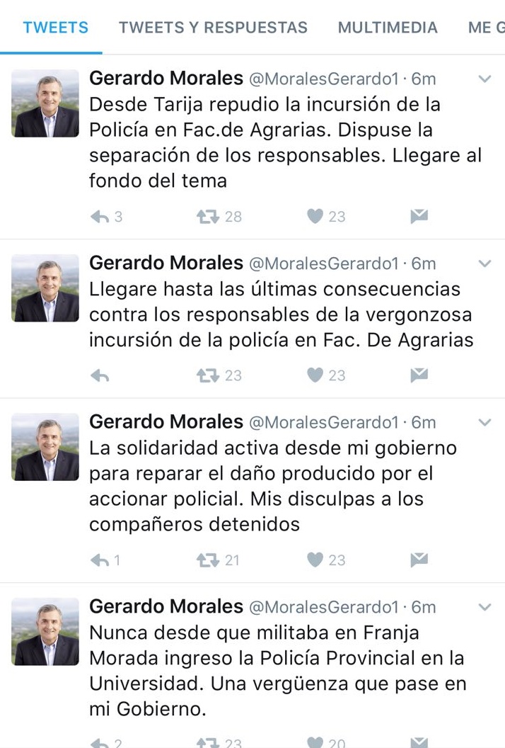 Entre los anuncios que brindó fue que separo a los responsables, refiriéndose a la policía, que irrumpió en el predio de la Facultad de Agrarias, mientras realizaban una fiesta en el lugar. Recalcó que llegará hasta las últimas consecuencias "contra los responsables de la vergonzosa incursión policial", calificó el mandatario provincial.