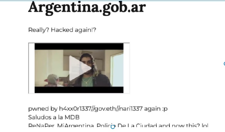 En la página principal del portal Mi Argentina, no solo se observó por un momento un video del rapero Homer el Mero Mero, sino que los ciberdelincuentes identificados como “h4xx0r1337 $gov.eth” dejaron mensajes en torno burlesco indicando “really? hacked again!?” (¿de verdad? ¿hackeado de nuevo?). Además, en el pie de página del portal incluyeron un mensaje en contra del mandatario al publicar “fuck Milei”.