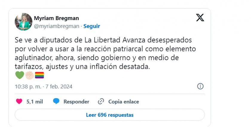 También mostró su descontento la legisladora Myriam Bregman, del Frente de Izquierda. “Se ve a diputados de La Libertad Avanza desesperados por volver a usar a la reacción patriarcal como elemento aglutinador, ahora, siendo gobierno y en medio de tarifazos, ajustes y una inflación desatada”, afirmó en sus redes.