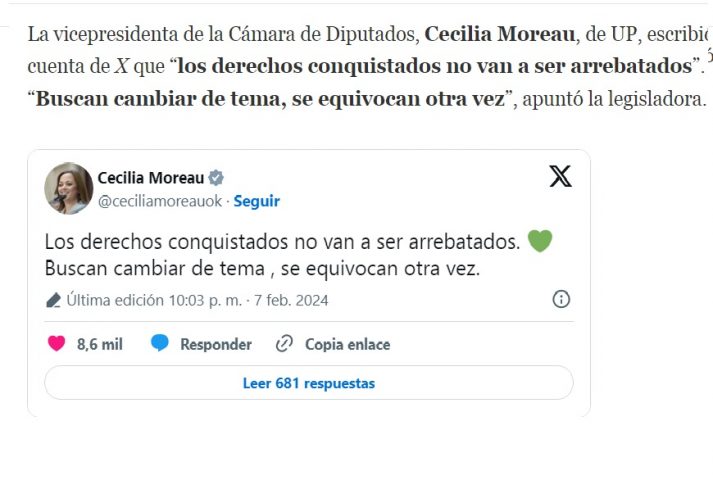 La vicepresidenta de la Cámara de Diputados, Cecilia Moreau, de UP, escribió en su cuenta de X que “los derechos conquistados no van a ser arrebatados”. “Buscan cambiar de tema, se equivocan otra vez”, apuntó la legisladora.