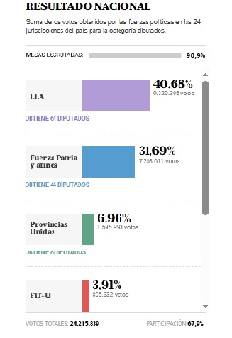- LLA 40,68% 9.329.396 votos OBTIENE 64 DIPUTADOS