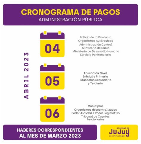 El cronograma de pagos de haberes correspondientes al mes de marzo inicia este sábado 4 de abril en la provincia de Jujuy así lo anunciaron desde gobierno. Los primeros en cobrar serán Policía de la Provincia, Organismos Autárquicos, Ministerio de Salud, Ministerio de Desarrollo Humano y Servicio Penitenciario.