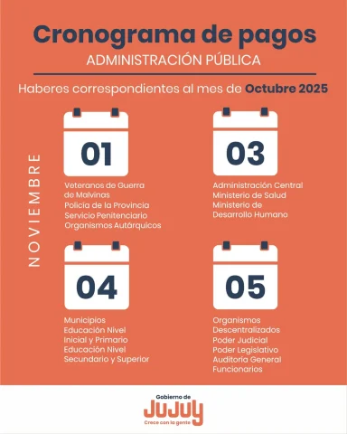 El Gobierno de Jujuy confirmó el calendario de pago de los haberes correspondientes al mes de octubre de 2025 para todo el personal de la Administración Pública Provincial. El cronograma, que inicia este sábado 1 de noviembre, se extenderá hasta el miércoles 5.