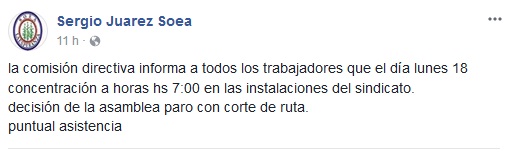 Se convoca a los trabajadores el día lunes 18 de diciembre a concentrarse en las instalaciones del sindicato para cumplir con la decisión que se ha tomado en la asamblea popular, de ir a un corte de ruta.