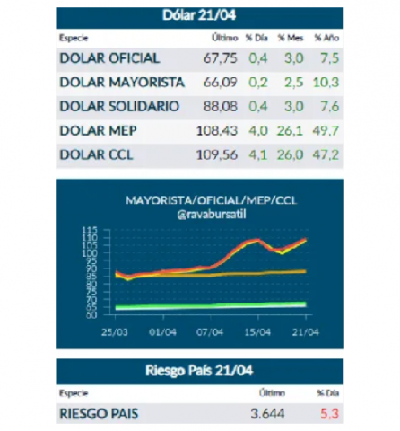 El dólar blue hoy miércoles 22 de abril de 2020 cotiza a 107 pesos para la venta y a 99 para la compra, en un mercado en que los tipos de cambio implícitos en las operaciones bursátiles volvieron a la zona de los 110 pesos.