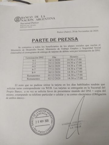 El Gerente del Banco de la Nacion sucursal Perico, Sr. Khazaal,. Jose Antonio, Informo a los beneficiarios de Planes Sociales que nuclea el Ministerio de Desarrollo social, Ministerio de Trabajo Empleo y Seguridad Social (Interzafra) a concurrir al Banco a retirar la Tarjeta de Débito en los días subsiguientes: