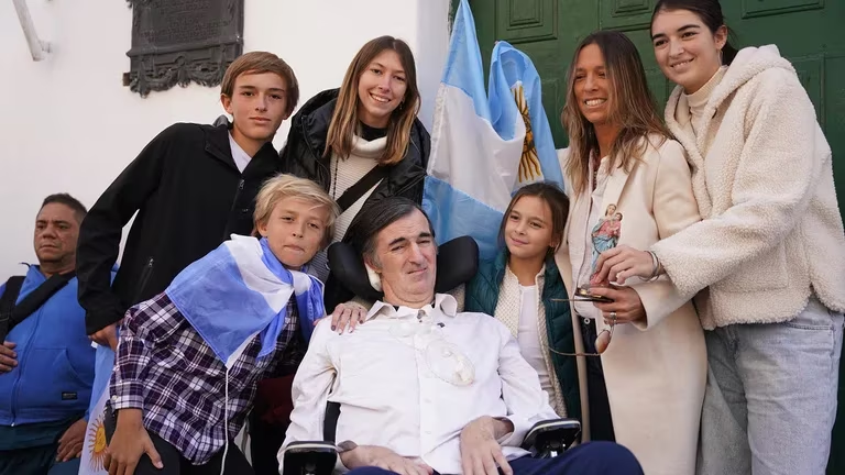 La ELA le impide a Bullrich el despliegue motriz y el habla. Pero el ex senador se mueve, habla y piensa sin pausa. Su cuerpo es su familia. María Eugenia Sequeiros es el nombre de su mujer, una mujer que es multitudes. Y sus cinco hijos, que estuvieron presentes en San Nicolás. Luz (20), Margarita (18), Agustín (14), Lucas (11) y Paz (8) también acompañaron a Esteban y estuvieron junto a él todo el acto. “Personalmente es un orgullo tener este marido tan amante de la argentina y con deseos tan grandes en su corazón”, relata la esposa del ex senador y detalla: “De alguna manera, creo que hoy está cumpliendo parte de su sueño, que lo tiene hace años”.