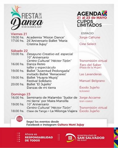 Este fin de semana, continúa la Fiesta de la Danza organizada por la Municipalidad de la Capital, a través de la secretaría de Cultura y Turismo, e invita a todos los vecinos a participar de las actividades y los talleres que ofrece este nuevo ciclo los dias viernes 21 al domingo 23, siempre respetando los protocolos sanitarios impuestos por el COE y transmitidas en vivo a través de Facebook e Instagram: Cultura Muni Jujuy.