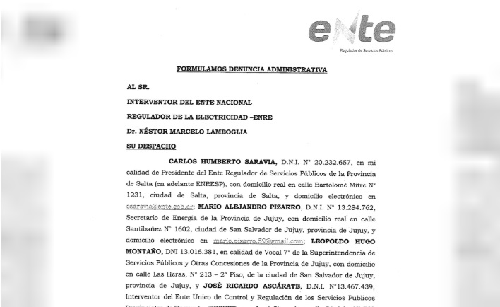 La denuncia administrativa fue presentada de manera conjunta en la sede del Ente Regulador de los Servicios Públicos de Salta, con la participación de Carlos Saravia, presidente del organismo salteño; Mario Pizarro, secretario de Energía de Jujuy; Hugo Montaño, de la Superintendencia de Servicios Públicos de Jujuy; y José Ascárate, del Ente de Control de Tucumán.