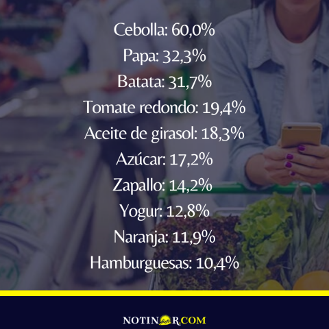 Entre los 10 alimentos que más aumentaron figura el kilo de cebolla, con un alza de 60% en agosto, seguido por el kilo de papa, con un incremento de 32,3 por ciento. En tanto, completó el podio el kilo de batata, con una suba en el sexto mes del año de 31,7 por ciento.