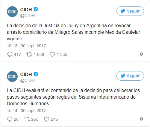 "La decisión de la Justicia de Jujuy en Argentina de revocar el arresto domiciliario de Milagro Sala incumple una medida cautelar vigente. La CIDH evaluará el contenido de la decisión para deliberar los pasos siguientes según reglas del Sistema Interamericano de Derechos Humanos", informó en su cuenta oficial de Twitter, refiriéndose a la revocación de la Cámara de Apelaciones de Jujuy a la prisión domiciliaria de Sala. Pese a que no se haría efectivo el traslado, ya que la defensa presentaría este lunes un recurso de efecto suspensivo.