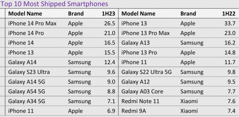 El modelo de gama alta de Samsung, el Galaxy S23 Ultra, mantuvo la misma posición que el Galaxy S22 Ultra 5G del año pasado, en el sexto puesto, pero sus envíos totales disminuyeron en 0,2 millones de unidades, hasta los 9,6 millones. En tanto, los Galaxy A14 5G, A54 5G y A34 5G ocuparon los puestos 7º, 8º y 9º, respectivamente.