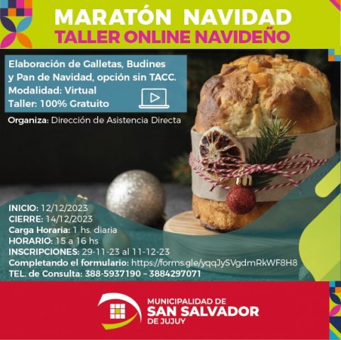 La Municipalidad de San Salvador de Jujuy dictará un taller online totalmente gratuito destinado al público en general, para la elaboración de galletas, budines y pan de navidad, opción sin TACC. Las inscripciones podrán concretarse completando un formulario a partir del 29 de noviembre.