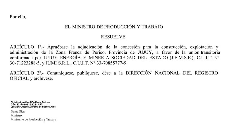 En lo que representa un paso más hacia la realización de las zonas francas en Jujuy, el Ministerio de Producción y Trabajo de la Nación, mediante Resolución 2019-623, aprobó este jueves la adjudicación de la concesión para la construcción, explotación y administración de la Zona Franca de Perico, a favor de la UTE conformada por Jujuy Energía y Minería Sociedad del Estado (JEMSE) y JUMI S.R.L.