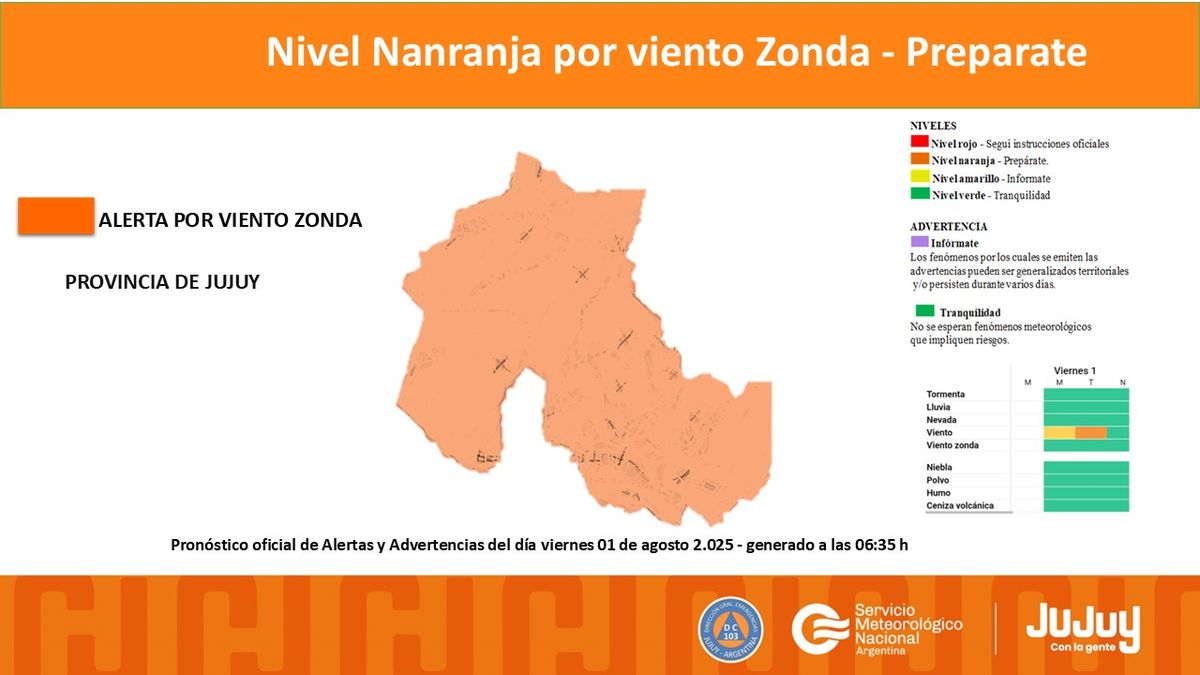 Las áreas en alerta naranja son Departamento Dr. Manuel Belgrano zona baja, Tilcara zona baja, El Carmen, Ledesma, Palpalá, San Antonio, San Pedro, Santa Bárbara y Valle Grande.
