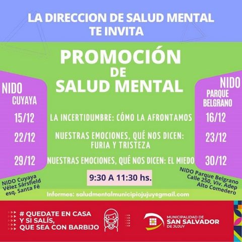 En tanto que el taller de “Promoción de Salud Mental” , se tratarán los temas: La incertidumbre: ¿cómo lo afrontamos?, Nuestras Emociones, qué nos dicen: furia y tristeza y Nuestras emociones, qué nos dicen: el miedo. Esta actividad es gratuita y se dictarán los días 12, 22 y 29 de diciembre, de 9.30 a 11.30hs., en el NIDO Cuyaya, ubicado en Veléz Sarsfield esquina Santa Fe. Mientras que en el NIDO del Parque Belgrano, sito en calle 250 Viv. ADEP del B° Alto Comedero, se realizará en idéntico horario los días 16,23 y 30 de diciembre.
