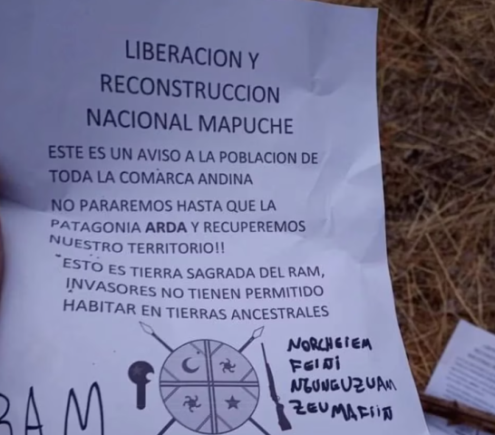 “Liberación y reconstrucción nacional mapuche. Este es un aviso a la población de toda la Comarca Andina: no pararemos hasta que la Patagonia arda y recuperemos nuestro territorio. Esto es tierra sagrada del RAM. Invasores no tienen permitido habitar en tierras ancestrales” dice el texto que comenzó a circular a través de las redes sociales.