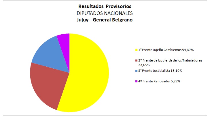 Lo relevante de estos primeros resultados es que hasta el momento en el Departamento Doctor Manuel Belgrano el Frente Justicialista se ubicaría en tercer lugar detrás del Frente de Izquierda y de los Trabajadores (PTS-PO) que se encuentra segundo, quedando a la cabeza el Frente Jujeño Cambiemos.