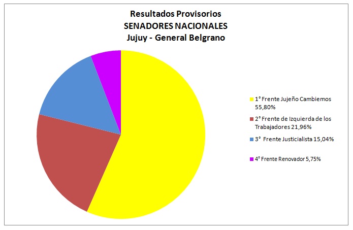 En la categoría a Senadores Nacionales el primer lugar lo estaría ocupando el Frente Jujeño Cambiemos, el segundo lugar el Frente Justicialista y el tercer lugar el Frente de Izquierda quedando el Frente Renovador en cuarto lugar.