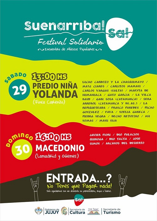 En la provincia de Jujuy se realizará el 1° Festival Solidario, Encuentro de Músicos Populares: “Suenarriba”, del que participarán artistas de distintos puntos del país, con una propuesta que engloba diferentes estilos musicales enmarcados en lo popular. La convocatoria será para el sábado 29 de agosto, desde horas 15:00, en el predio de La Niña Yolanda (finca Carenzo, Lozano); y el domingo 30, a partir de horas 16:00, en el Centro Cultural “Macedonio Graz”.