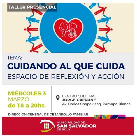 Organizado por el departamento de Inclusión de Personas con Discapacidad, dependiente de la secretaría de Desarrollo Humano, se realizará el taller presencial “Cuidando al que cuida”, un espacio de reflexión y acción, en las instalaciones del Centro Cultural “Jorge Cafrune”, cita en Avenida Carlos Snopek, esquina Pampa Blanca de Alto Comedero, en el horario de 18 a 20.