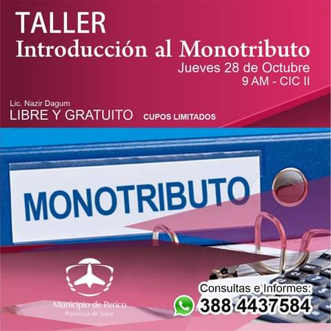 La Dirección de Comercio del Municipio de Perico, Invita a los interesados al Taller Gratuito sobre Monotributo, que será dictado por el Licenciado Nazir Dagum el día jueves 2 8 de Octubre a horas 09 en el CIC 2, en el mismo, se responderán preguntas como: Que es ser Monotributista? Que se necesita para serlo? En qué Categoría me inscribo? Por inscripciones e informes comúnicarse al 3884437584. Cupos limitados.