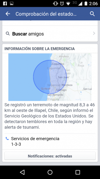 El fuerte terremoto de 8,4 grados en la escala de Richter que tuvo su epicentro en la localidad de Illapel en la Cuarta Región de Chile, no ha dejado a nadie indiferente en la incesante búsqueda de información sobre los seres queridos y conocidos. Por eso, la red social Facebook se cuadró desde la madrugrada de este jueves con el esfuerzo de habilitar una herramienta para informar a través de notificaciones y un sistema de geolocalización, como se encuentran tus familiares y amigos.