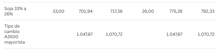 Previo a la entrada en vigencia de la reducción en las retenciones, el tipo de cambio mayorista se situaba en $1.047,67. Para el caso de la soja, que tenía 33% de derechos de exportación, el tipo de cambio efectivo con blend era de $717,38 por dólar. Con la rebaja a 26%, este valor ascendió a $792,33, representando una mejora en los ingresos por tonelada comercializada.