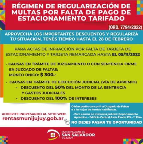 Los contribuyentes podrán acceder al Régimen de Regularización de Multas hasta el martes 28 de febrero a través del sitio web: www.rentasmunijujuy.gob.ar