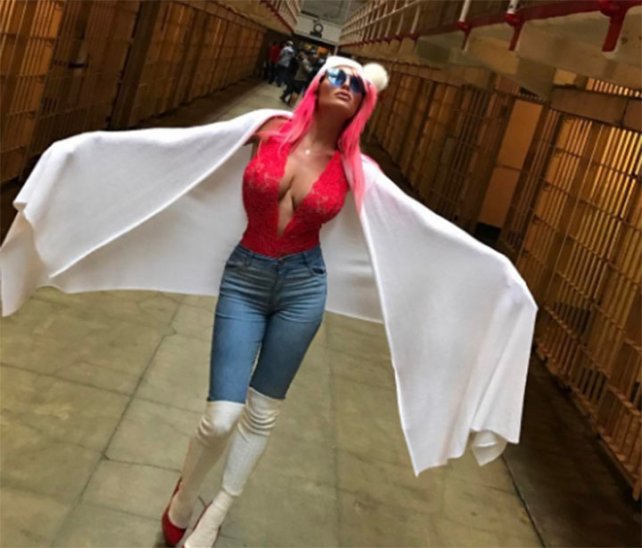 Así y con su explosivo vestuario se tomo fotos en las celdas donde estuvo arrestado uno de los presos más conocidos en la historia como Al Capone.